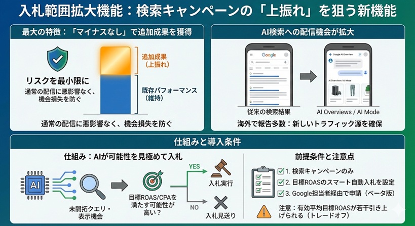 なぜ検索キャンペーンだけなのか?それは、この機能が目標ROASを設定した検索キャンペーンで、AIモードとAI Overviewsという新しい検索体験への配信機会を最大化するために設計されているためです。P-MAXは既に全配信面を自動最適化する仕組みを持っているため、この機能は不要です。検索キャンペーンにこそ、この拡張機能が必要なのです。