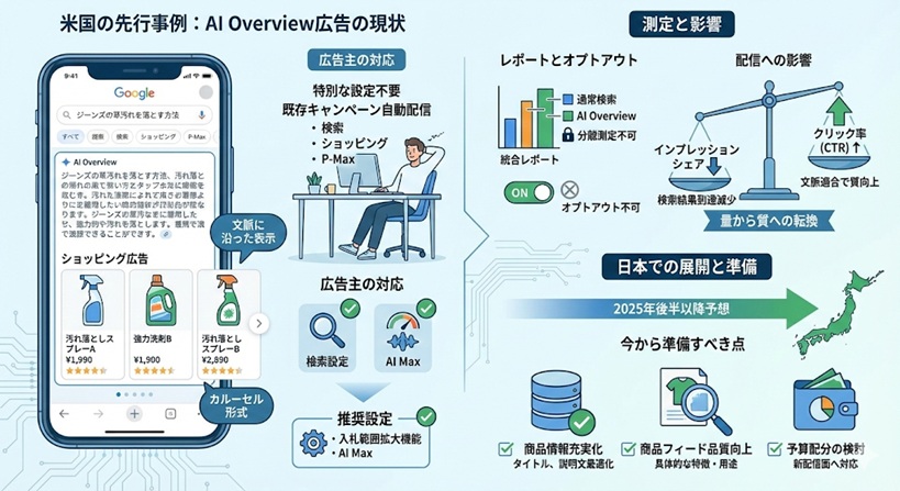024年10月から米国で正式開始されたAI Overview内での広告配信は、数か月のテスト期間を経て本格運用に入りました。この先行事例から得られる知見は、日本での展開に備える上で重要な指針となります。