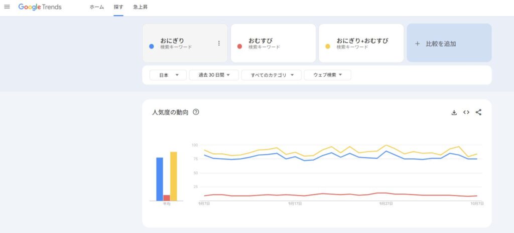 この検索をすると、「おにぎり」と「おむすび」の検索ボリュームを合算したトレンドが表示されます。別々に見ていた時には見えなかった、真の検索ボリュームが可視化されるのです。