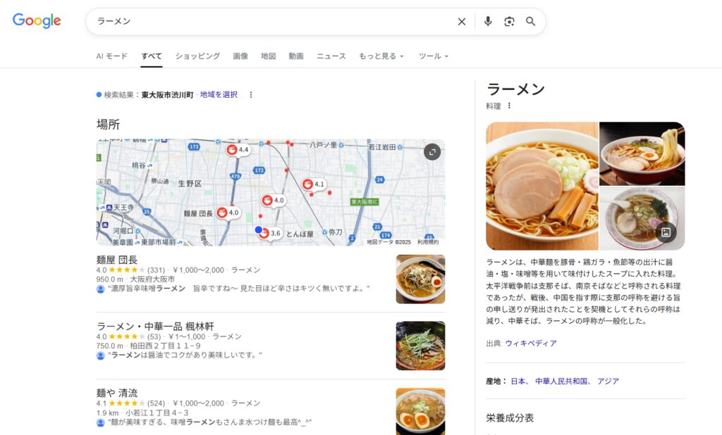 - 設定後、Google検索で「ラーメン」と検索してみてください。GS Location Changerが有効になっていると、まるで大阪から検索したかのような、大阪におけるラーメン関連の広告やオーガニック検索結果が表示されます。 これにより、Googleプレビューツールでは分からなかった「地名を含まないキーワード」でのローカライズされた検索結果や、指名検索での広告表示の有無、そして検索結果全体での表示状況を正確に把握することができます。