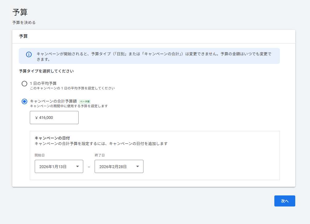 一方、「キャンペーンの合計予算額」は期間ベースの予算管理です。例えば「2026年1月13日〜2月28日で416,000円」といった設定が可能になります。