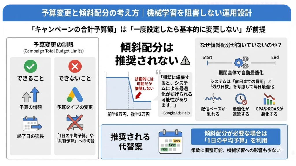 キャンペーンの合計予算額の設計思想は「期間全体で自動最適化する」ことです。Googleのヘルプでも、「頻繁に編集すると、システムによる最適化が妨げられる可能性があるため、編集は最小限に抑えます」と明記されています。