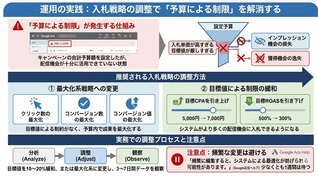 実際の運用では、まず「予算による制限」が発生しているキャンペーンを特定し、現在の入札戦略と目標値を確認します。次に、過去のCPA、ROAS、インプレッションシェアを分析し、どの程度の調整が必要かを判断します。その上で、目標値を10〜20%程度緩和するか、最大化系戦略に変更し、3〜7日間データを観察して予算使用率とパフォーマンスを確認します。