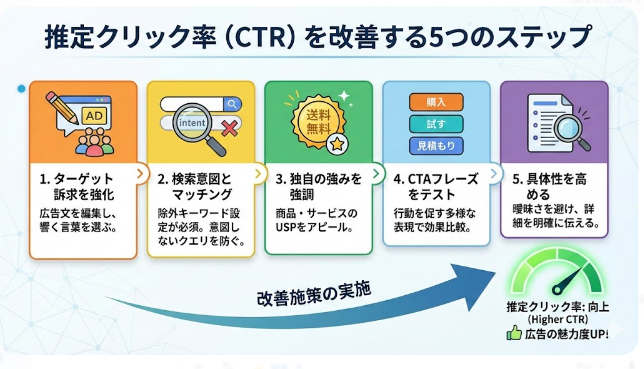 これらの改善施策を実施することで、推定クリック率を向上させ、広告の魅力度を高めることができます。