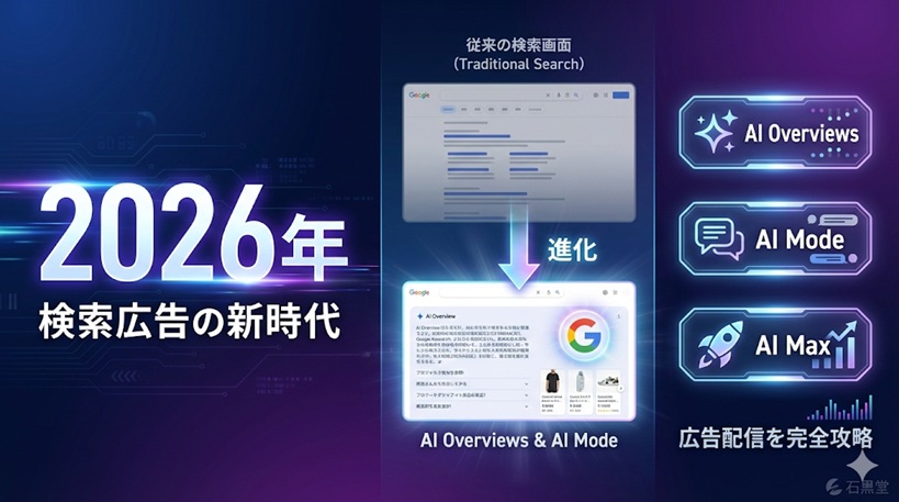 2026年、Google検索広告は新時代を迎えます。AI OverviewsとAI Modeでの広告配信が日本でも間もなく開始され、従来の検索広告だけでは対応できない時代が到来します。本記事では、AI検索で広告を表示させるために必要な3つのキャンペーンタイプと、特に重要なAI Maxの5つの機能を実績データとともに徹底解説。石黒堂の運用実績では、AI Max導入でCTRが21.53%と通常の11倍を記録しました。今すぐ導入すべき理由と具体的な設定手順まで、AI検索時代の広告運用を完全網羅します。