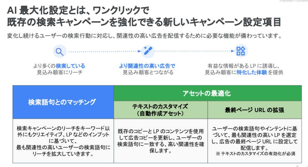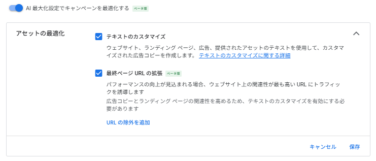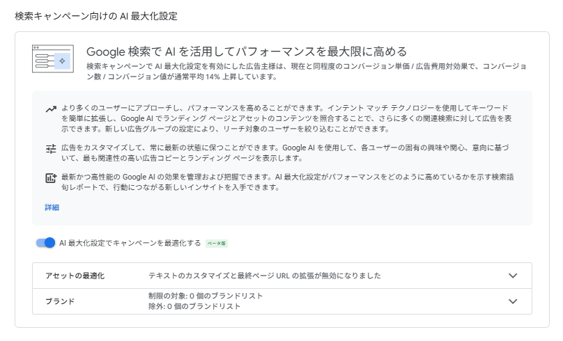 参照:検索キャンペーン向け AI 最大化設定(ベータ版)について