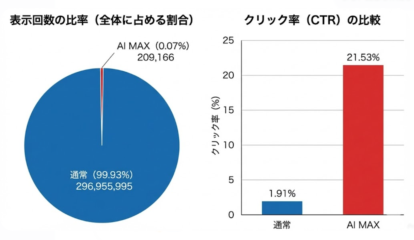 最大の発見は、クリック率の圧倒的な高さです。通常配信の1.91%に対して、AI Maxは21.53%という驚異的な数値を記録しています。これは、Googleのアルゴリズムがオークション単位で極めて質の高いユーザー、つまりコンバージョンの可能性が非常に高いタイミングとユーザーを的確に捉えている証拠といえるでしょう。