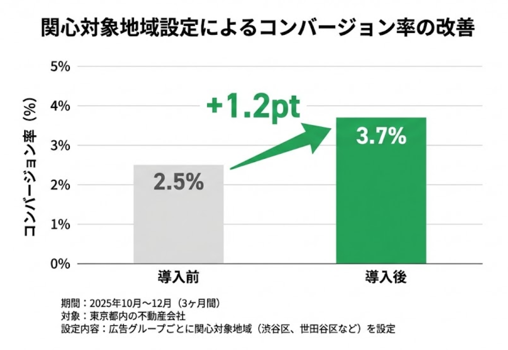 東京の不動産会社で、AI Maxの「関心対象地域」を広告グループごとに設定したところ、わずか3ヶ月でコンバージョン率が2.5%から3.7%へと1.2ポイント上昇しました(+48%改善)。渋谷区・世田谷区など、エリアごとに広告グループを分け、それぞれに関心対象地域を設定しただけで、この成果が得られました。地域に関心のあるユーザーに的確にリーチできたことが、CVR改善の要因です。