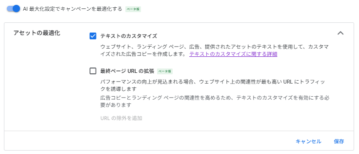 キャンペーン単位で設定します。これは従来の「自動作成アセット」がAI Maxに統合されたものです。ウェブサイト、ランディングページ、広告、提供されたアセットのテキストを使用して、カスタマイズされた広告コピーを自動生成します。