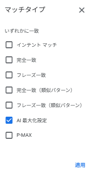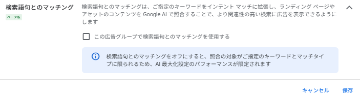 重要: この機能をオフにすると、照合の対象が指定したキーワードとマッチタイプに限られるため、AI Max全体のパフォーマンスが限定されます。つまり、AI Maxの効果を最大化するには、この機能をオンにしておく必要があります。逆にいうと「完全一致」「フレーズ一致」のマッチタイプの場合は拡張幅が大きくなってしまうため、ひっかけたくないキーワードも対象になるので気を付けてください。