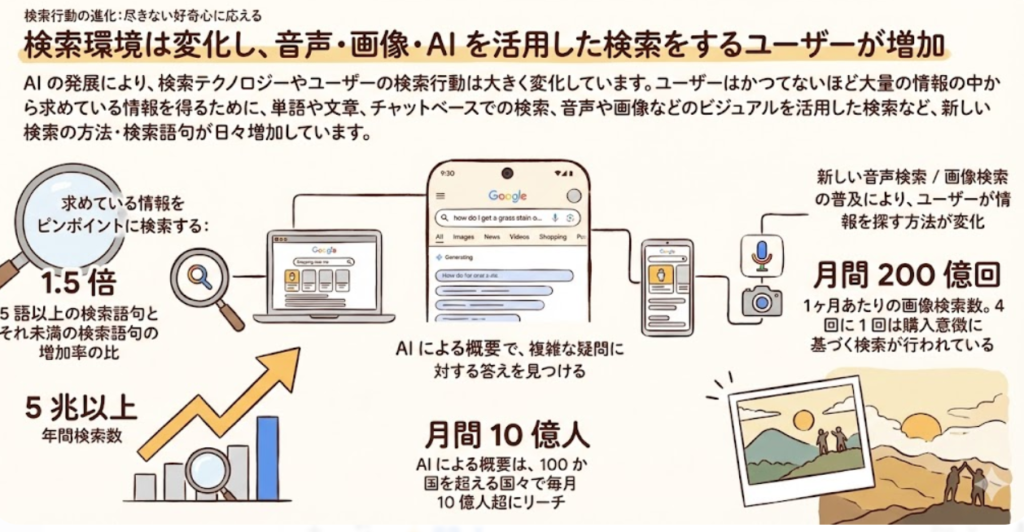 Google検索は2024年から2025年にかけて劇的な変化を遂げました。AI Overviewsは2024年から本格展開され、検索クエリに対してAIが生成した概要を検索結果上部に表示するようになりました。米国やインドでは、AI Overviewsが表示されるクエリでGoogle検索の利用が10%以上増加しています。