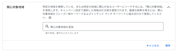 重要: 関心対象地域は、特定の地域に対する関心に基づいてユーザーを見つける新しい方法であり、キャンペーン設定の地域ターゲティングを拡大するものではありません。広告は、キャンペーン設定で選択した地域のユーザーにのみ引き続き表示されます。