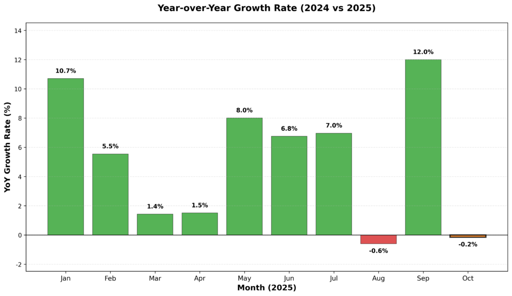 2025年10月の売上規模8,140億円は、2025年では3月(1兆1,458億円)、9月(8,806億円)に次ぐ水準となりました。2025年1-10月の累計売上高は8兆2,302億円に達し、前年同期比4.9%増という堅調な成長を維持しています。月平均では8,230億円と高水準を保っており、9月の一時的な急伸を除いても、通年での成長トレンドは確実に継続しています。