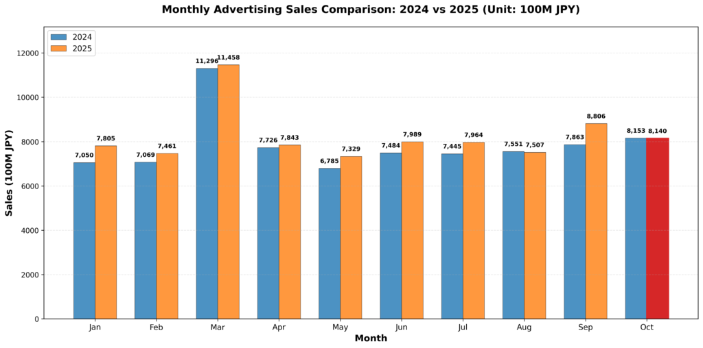 2025年10月の-0.2%という結果は、9月の急伸(12.0%増)からの反動減として理解できます。しかし前年同月とほぼ横ばいの水準を維持したことで、市場の基礎的な強さが確認されました。1-10月を通じて前年同期比4.9%増を達成し、月平均8,230億円という高水準を保てていることは、広告市場の持続的な成長力を示しています。10月の微減は9月の集中的な予算執行の反動によるものと見られ、年末商戦期に向けた第4四半期の残り期間での回復が期待されます。