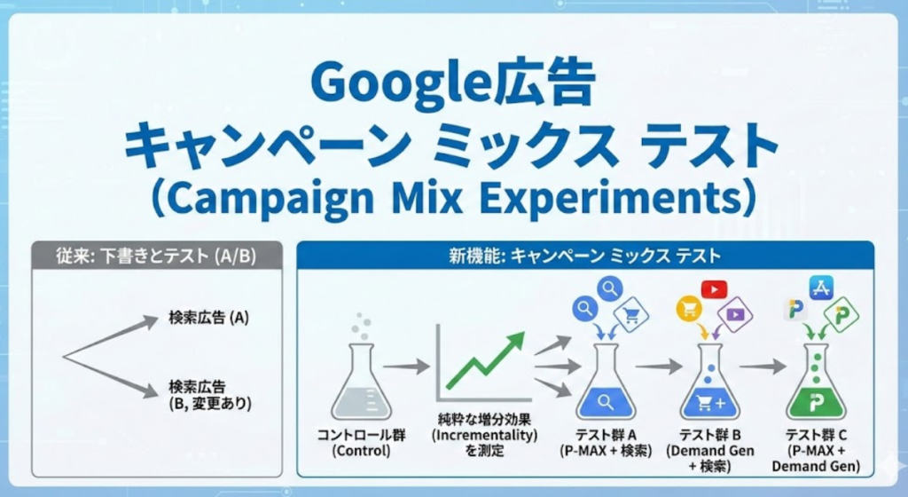 キャンペーン ミックス テストは、複数のキャンペーンタイプを組み合わせた施策の効果を科学的に検証できる強力な機能です。