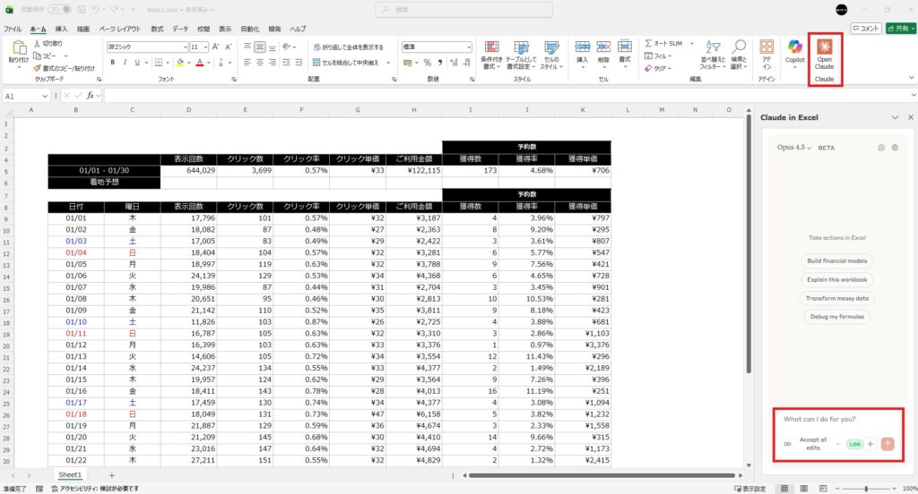 しかし、Claude in Excelなら「Open Claude」ボタンを押して、プロンプトを入れるだけでシートの計算やグラフの作成をしてくれます。