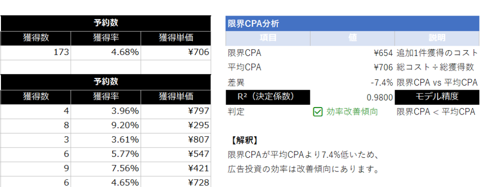 従来の業務: 「今月と先月でCPAがどれだけ改善したか」という増分CPA、「予算を20%増やしたらCVはどう変化するか」というシミュレーション、「複数キャンペーンに予算をどう配分すべきか」という最適化計算など、高度な分析になるほど手作業では限界がありました。