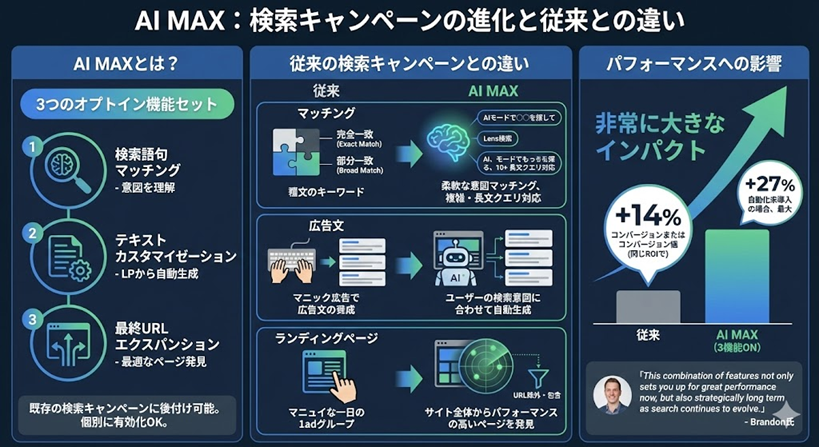 AI MAXは、既存の検索キャンペーンを次世代のパフォーマンスに対応させるための3つのオプトイン機能のセットです。具体的には、検索語句マッチング、テキストカスタマイゼーション、最終URLエクスパンションの3つで構成されています。従来の検索キャンペーンに後付けできる機能として設計されており、一度にすべてを有効化する必要はありません。