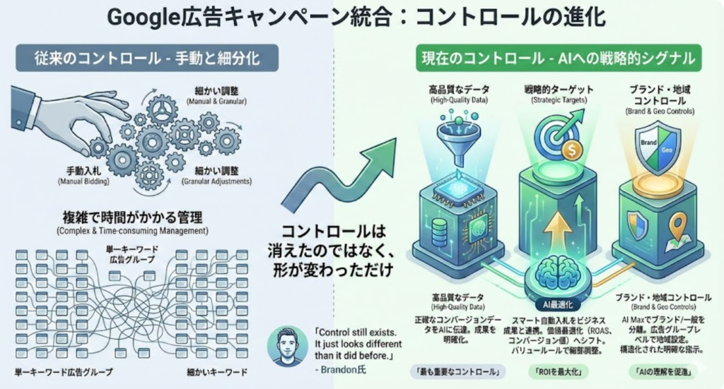 最も重要なのは、コントロールの定義が変わったことを理解することです。**手動入札や単一キーワード広告グループによる細かな調整から、高品質なコンバージョンデータ、戦略的ターゲット、ブランド・地域コントロールといった新しい形のコントロールへとシフトしています。これは制約ではなく、より効率的にビジネス成果を出すための進化です。