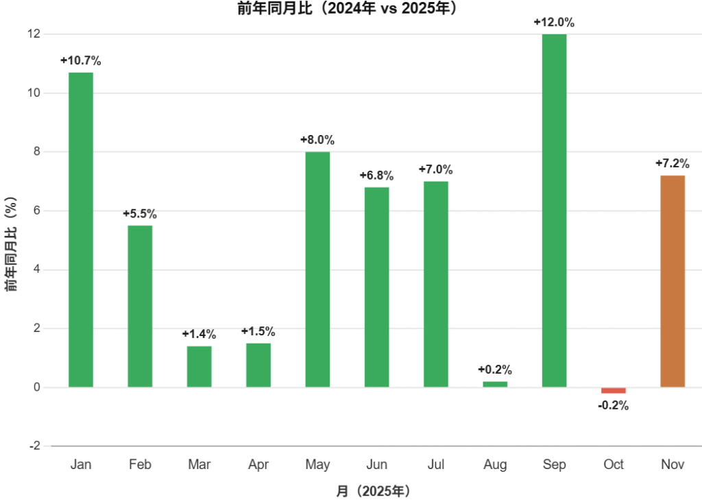 2025年11月の売上規模8,442億円は、2025年では3月(1兆1,458億円)、9月(8,806億円)に次ぐ年間3位の水準となりました。2025年1-11月の累計売上高は9兆803億円に達し、前年同期比+5.2%増という堅調な成長を維持しています。月平均では8,255億円と高水準を保っており、通年での成長トレンドが確実に継続しています。