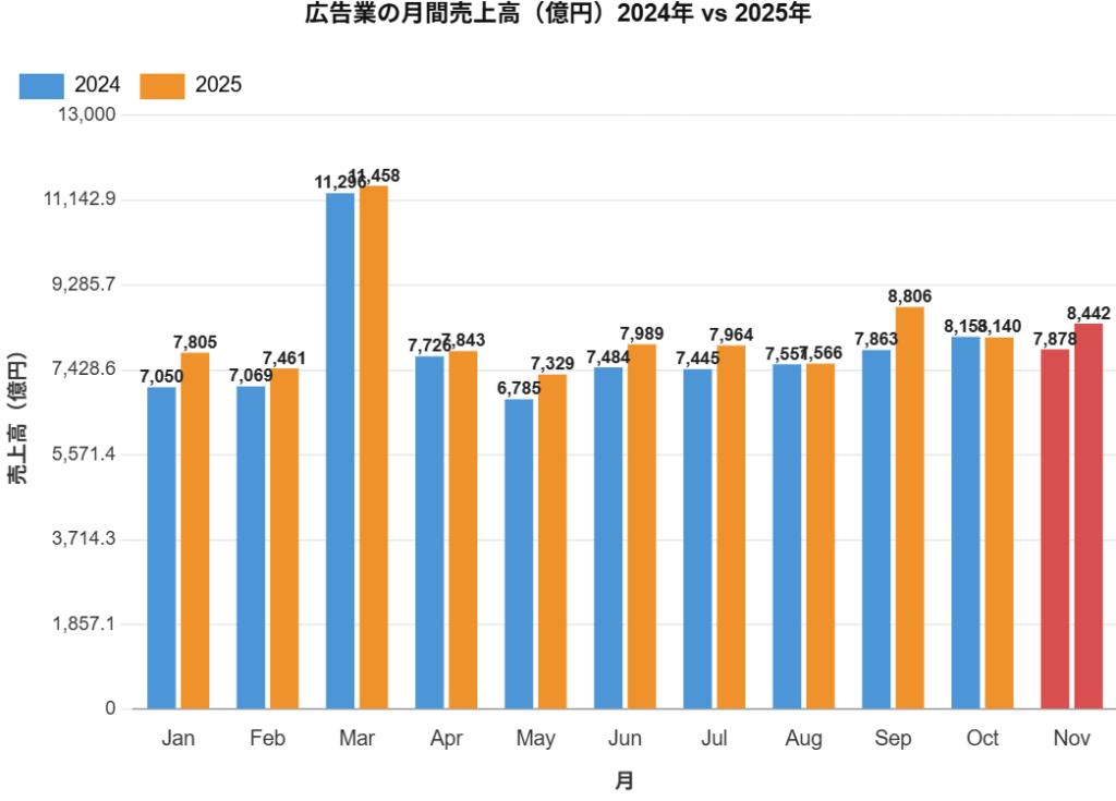 総務省統計局の「サービス産業動態統計調査」によると、2025年11月の広告業の月間売上高は844,153百万円(約8,442億円)で、前年同月比+7.2%と力強い成長となりました。