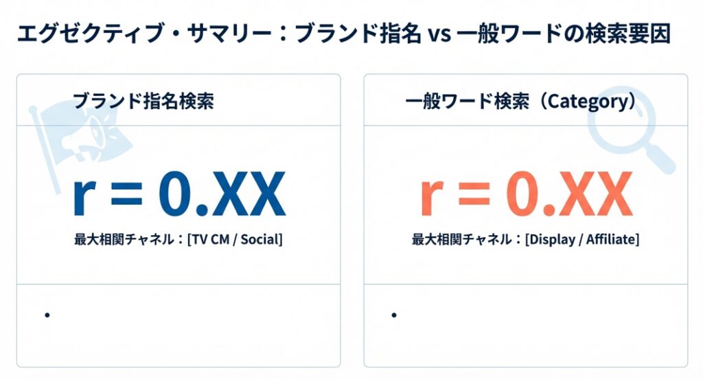 相関係数は「どこを深掘りすべきか」を教えてくれる入口の指標です。 ここから費用効率や指名検索への影響を確認して、初めて予算判断に使える情報になります。
