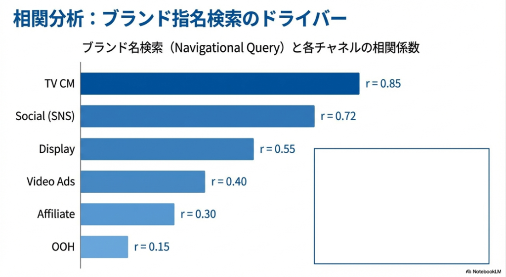 それなら、GA4のチャンネル別データとSearch Consoleのブランド/非ブランド別データをNotebookLMに食わせて、相関係数を出し、費用効率と指名検索の変化を見たほうが、はるかに速くて実用的です。 今日から誰でもできます。
