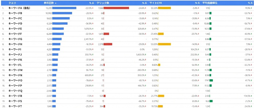 一般ワードは、AIの回答枠や動画枠、パーソナライズされた競合サイトの表示によって「面」を奪われ、表示回数とクリック数が激減しました。平均掲載順位が上がっている(ように見える)ものもありますが、実態としての流入は減っているケースが大半です。