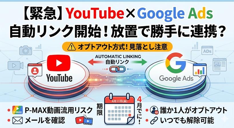 今回の自動リンクで最も見落としやすいのは、「何もしなければ勝手にリンクされる」というオプトアウト方式になっている点です。これまでのGoogle Adsの機能追加はユーザーが自ら設定するものがほとんどでしたが、今回は逆です。メールを見逃すだけでリンクが成立し、チャンネルの動画がP-MAXの広告素材として使われる可能性が出てきます。特に複数アカウントを管理している運用者や、代理店経由で運用を任せているケースでは、通知メール自体が埋もれやすいため注意が必要です。4月11日までにメールを確認し、判断することをおすすめします。